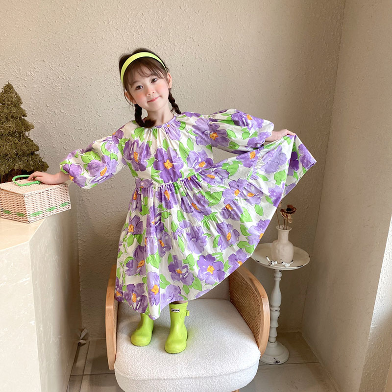 キッズ服 ワンピース 花柄 Aライン キッズ衣装 子供衣装 パフスリーブ 女の子 長袖 春秋着 子供服 女の子用 フラワー ハナ はな flower カジュアルウェアー おしゃれ 可愛い 90 100