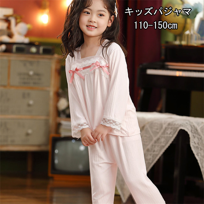 パジャマ キッズ メリヤス 女の子 レディース かわいい裾フリル ジュニア おしゃれ 長袖 部屋着 長袖 子供 薄手 ルームウェア プリンセス 妖精 レース お姫様 ピンク可愛い柄上下セットセットアッ