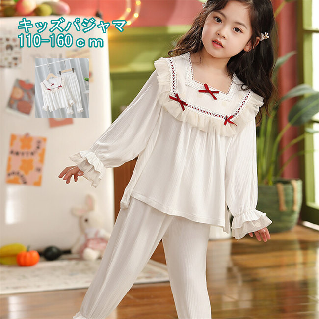 パジャマ キッズ メリヤス 女の子 レディース かわいい裾フリル ジュニア おしゃれ 長袖 部屋着 長袖 子供 薄手 ルームウェア プリンセス 妖精 レース お姫様 ホワイト可愛いリボン上下セットセッ