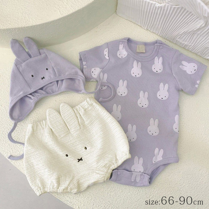 ベビー女の子パープルうさぎ半袖ロンパース3点セット 耳付きブルマ ボンネット 赤ちゃん セットアップ 退院着 夏 コットン 綿 子供服 セット ベビー 帽子 カバーオール