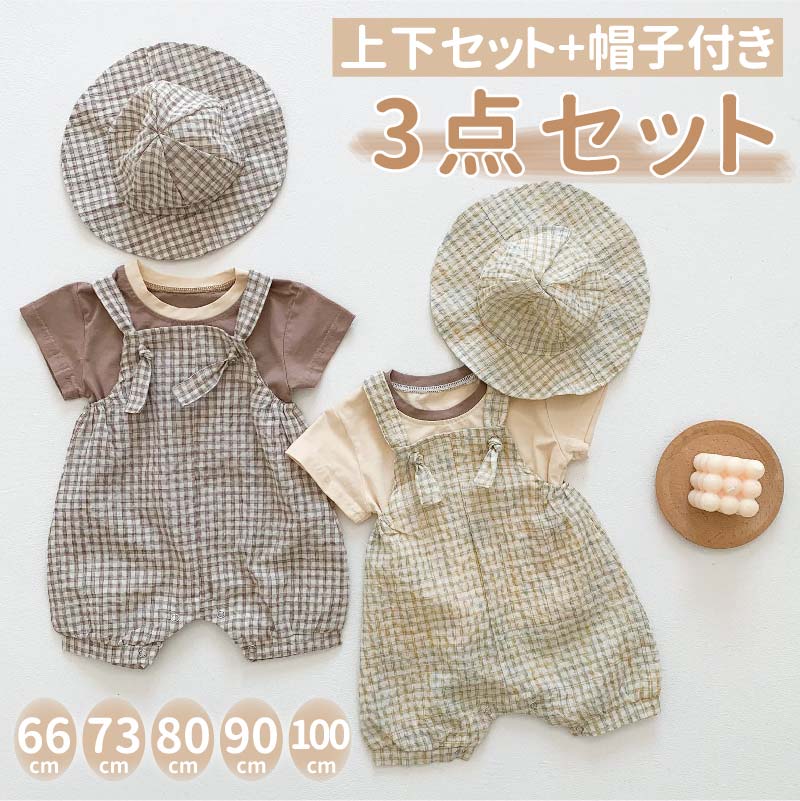 ベビー サロペット ベビーサロペット ベビー服 女の子 男の子 ベビー 夏服 半袖 Tシャツ 帽子 3点セット チェック柄 ロンパース オーバーオール オールインワン 66 73 80 90 赤ちゃ