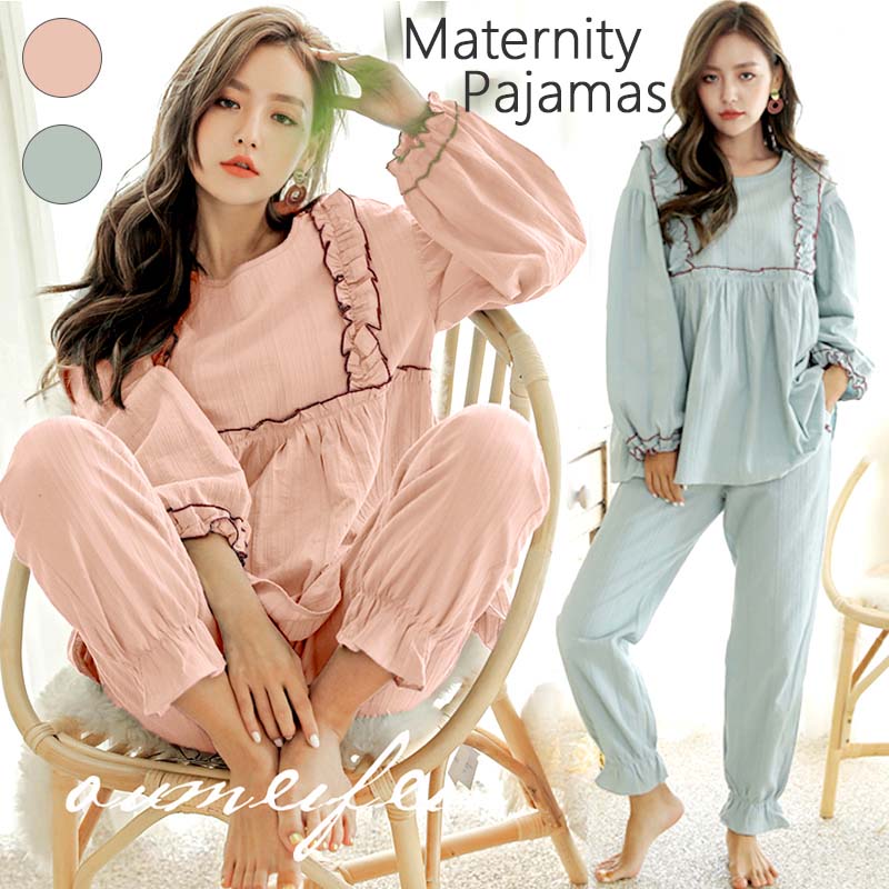 マタニティ パジャマ 春夏 長袖 上下セット シャツパジャマ フリル トップス ウエスト調節付き 授乳服 マタニティウェア 産後 姫系 可愛い 秋着