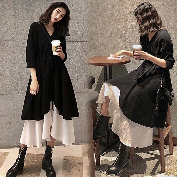 ワンピース 秋冬 長袖 おしゃれ キャミソール ロング ロングブラウス 綿麻 七分袖 マタニティウエア 2点セット