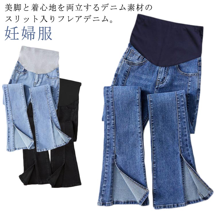 レディース デニムパンツ フレアパンツ 妊婦服 春 秋 マタニティ 美脚 ストレッチ スリット ボトムス スキニーパンツ 産前 ズボン ストレッチ 産後 ジーンズ マタニティウェア 10分丈 トレンド