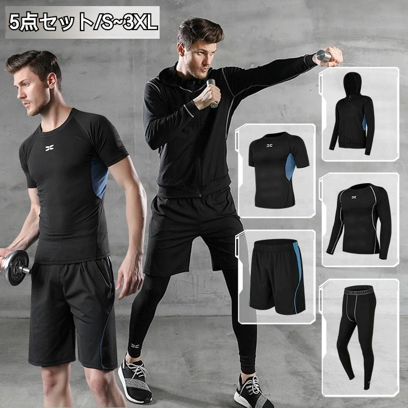 コンプレッションウェア ランニングウェア トレーニングウェア 上下 長袖 半袖 メンズスポーツウェア 5点セット おしゃれ パーカー トレーニング ランニング ショートパンツ レギンス c-yundo