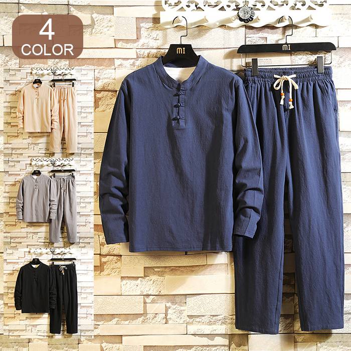 セットアップ メンズ ジャージ 春秋 薄手 リネンセットアップ ゆったり 上下セット スウェット 綿麻 長袖 シャツ ロングパンツ