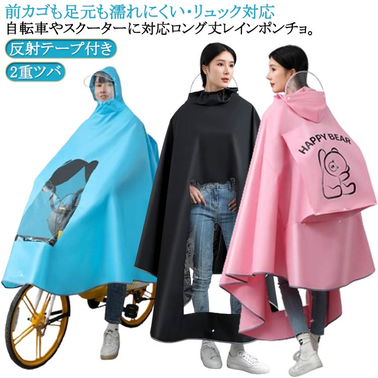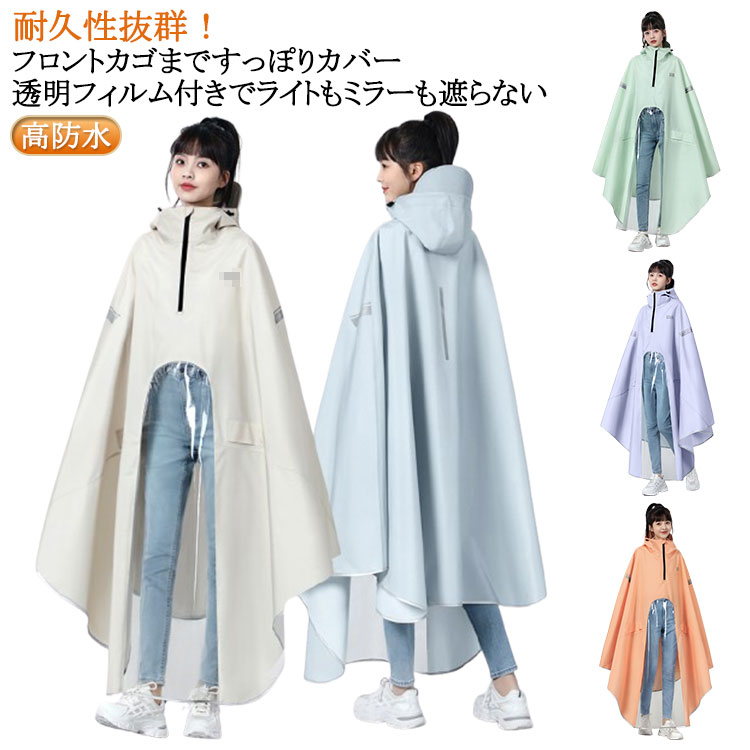 裾舞い上がり防止 めくれ防止フック付き カゴまで 自転車 レインコート レインポンチョ 電動アシスト自転車 自転車 反射テープ付き スクーター ロング丈