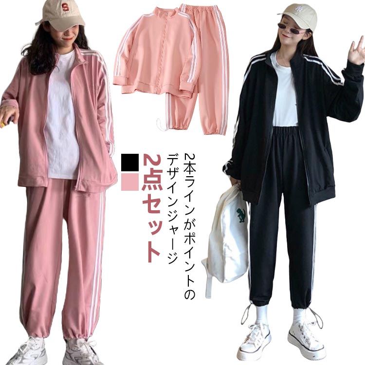 ゆったり 長袖 大人用 セットアップ ライン ジャージ 上下セット 上下 セット ジム ランニングウェア かわいい 2点セット 黒 ブラック ピンク