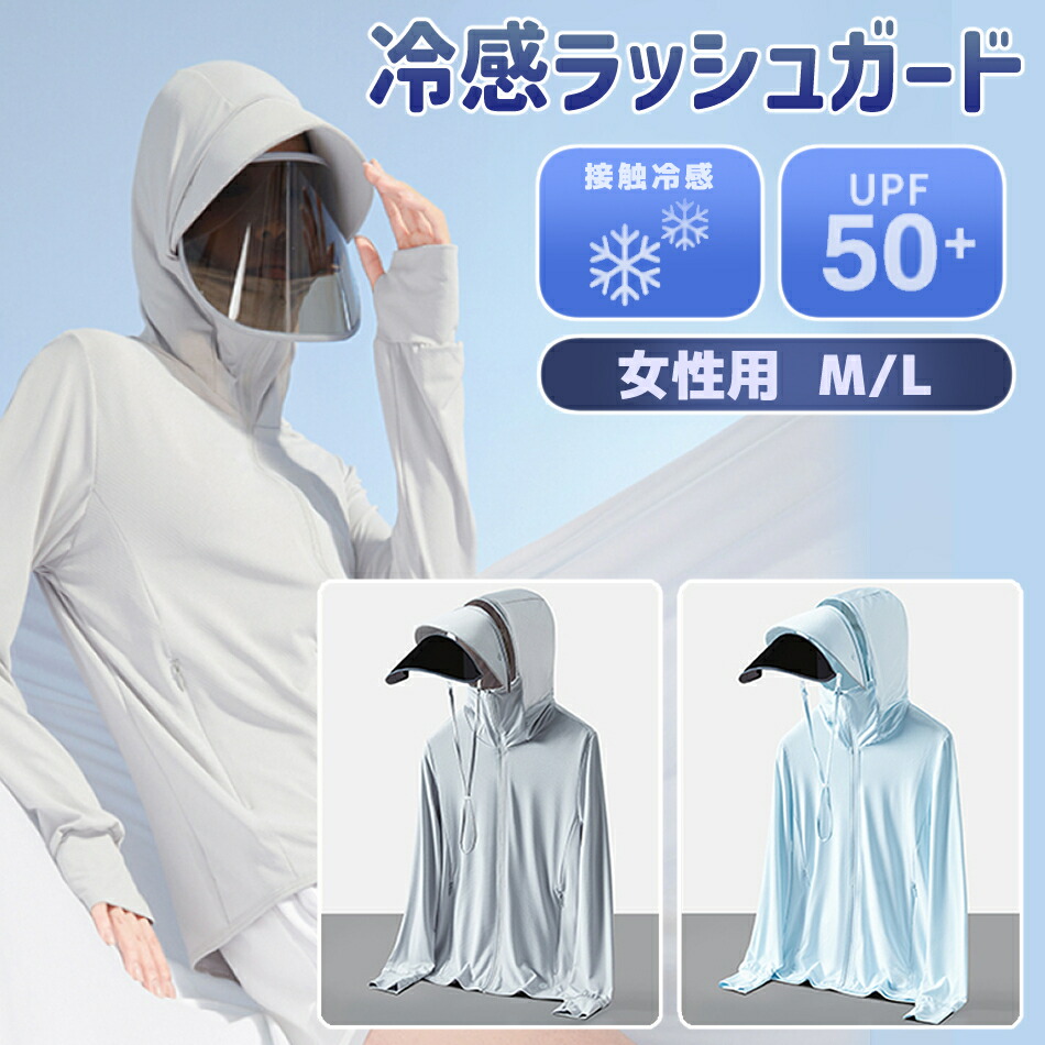 ラッシュパーカー UPF50+ 紫外線対策 ラッシュガード レディース 接触冷感 涼感 ひんやり 日焼け止め uvカット 指穴付き ツバ付き フード付き 通気性 薄手 夏服 自転車用