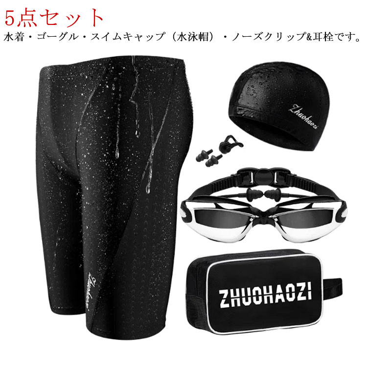 5点セット スイムバック キャップ ゴーグル 耳栓 鼻栓付 スイムキャップ ミラーゴーグル付きスポーツ アウトドア 水泳 競技水着 メンズ競技水着