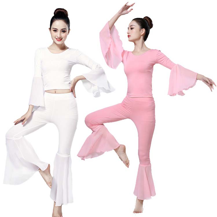 黒 ガウチョパンツ 上下2点セット 白 バレエ 衣装 ピンク ヨガ レッスンウェア ダンス衣装 ストレッチダンス練習着 古典ダンス衣装 袖フリルトップス 衣装 体操服