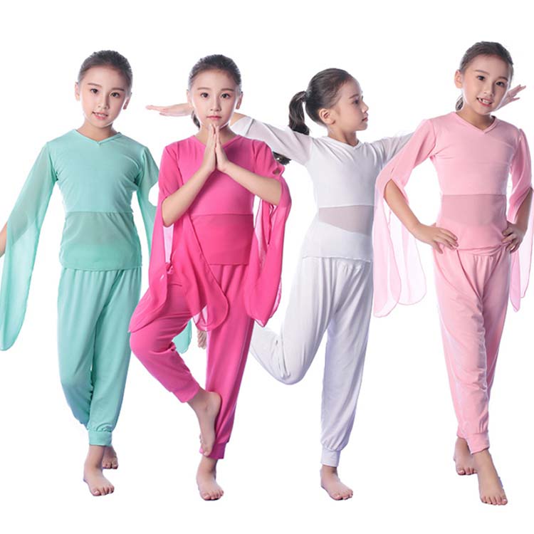 子供 古典ダンス ダンス衣装 ピンク 140 ローズ 女の子 緑 ウェア ヨガ スリット 水袖 白 可愛い 演出衣装 レッスンウェア 飄逸 150 体操 上下2点セットアップ 長袖 130 120