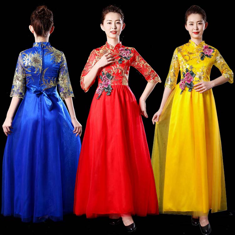 改良漢服 ロング中華服 花刺繍チャイナドレス 中国風古典ダンス衣装 チャイナ風舞台ステージ演出服 レディースチュールワンピース ロング中華ドレス ニ胡箏古典楽器演奏服