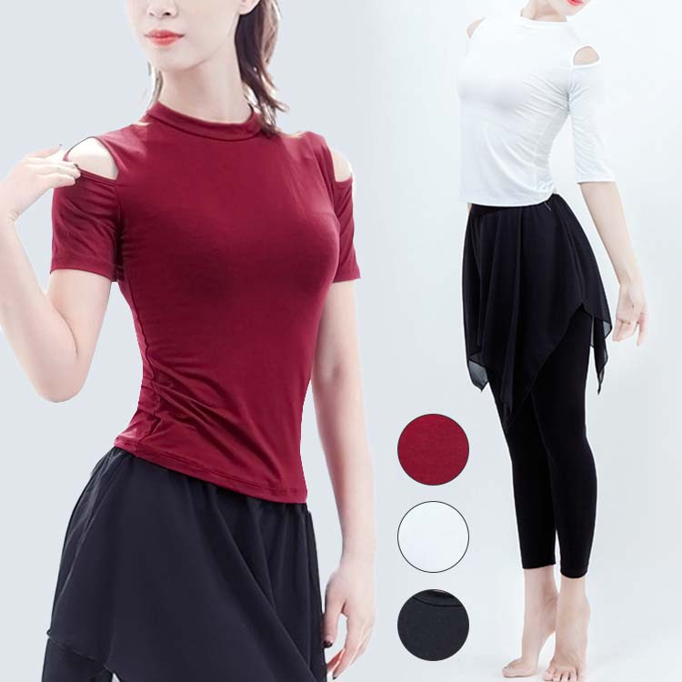 社交ダンス ジャズ 肩漏れ 無地 バレエ モダンダンス 3 トップス 白 古典ダンス 5分袖 カジュアルシャツ 黒 2 ヨガ 長袖 練習着 カットソー ダンス衣装 肩穴 伸縮性