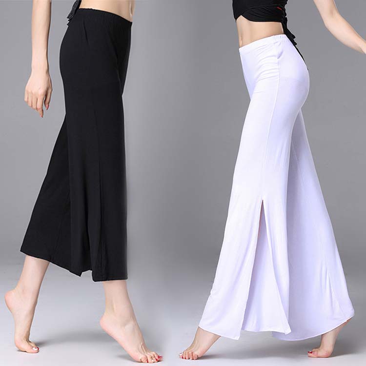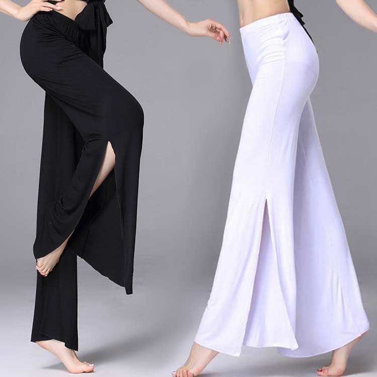 ブラック ベリーダンスパンツ レッスン着 モダール ラテン ホワイト ハイスリット入 バレエ社交ダンスウエア 古典舞踊ダンスパンツ レディースフレアワイドパンツ ヨガパンツ