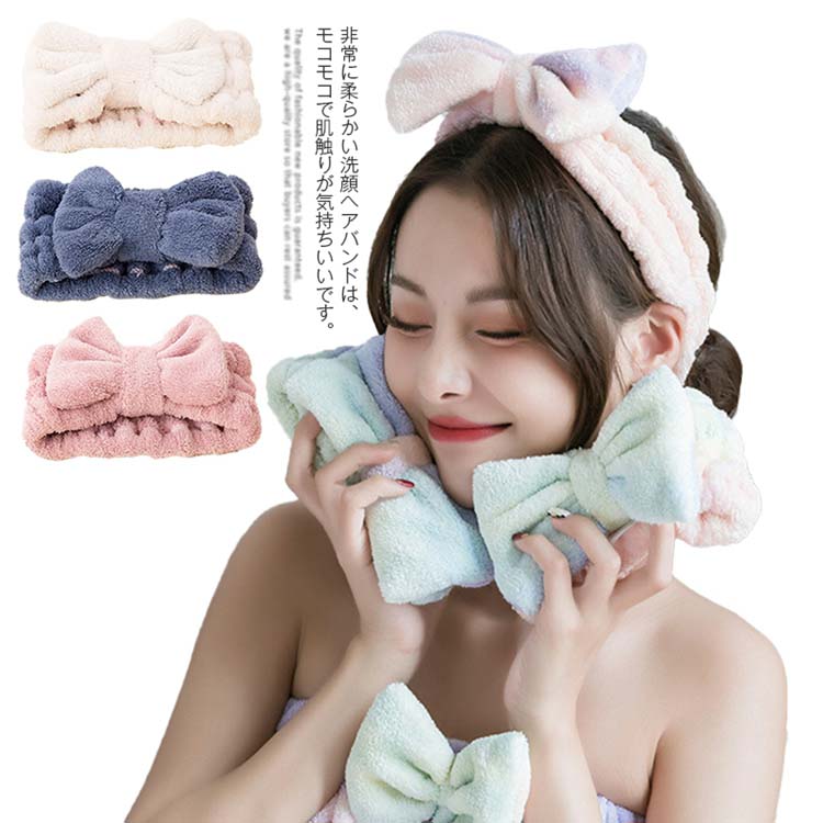 ヘアバンド リボン レディース 3color 吸水 洗顔用 ふわふわ かわいい お風呂上り シャワー メイクアップ お化粧 お泊り 出張 旅行 トラベル 国内 海外旅行 ギフト