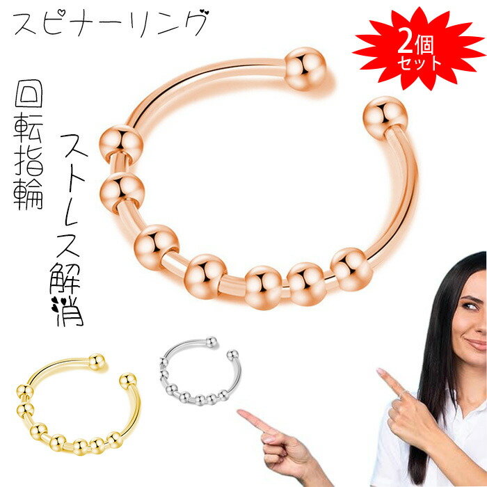 2個セット 女性用スピナーリング ストレス解消リング ジュエリー回転可能なビーズ付き 調節可能 レディース メンズ 心配リング 面白い