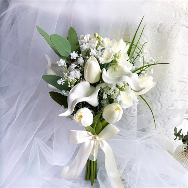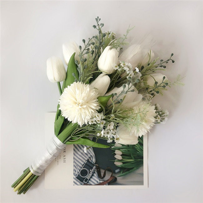 ホワイト チューリップウェディングブーケ 造花ブーケ ブライダルブーケ ラウンドブーケ トスブーケ 結婚式 花束