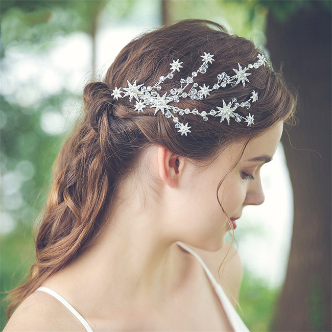 小枝ヘッドドレスビーズ星パーティー ウェディング ブライダル 結婚式 2次会 演奏会 発表会 コンサート 披露宴 上品質なヘッドアクセサリー レディース お花嫁 髪飾り着物 シルバー19*8.5