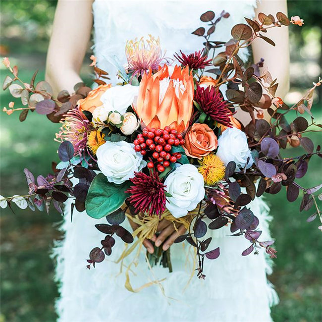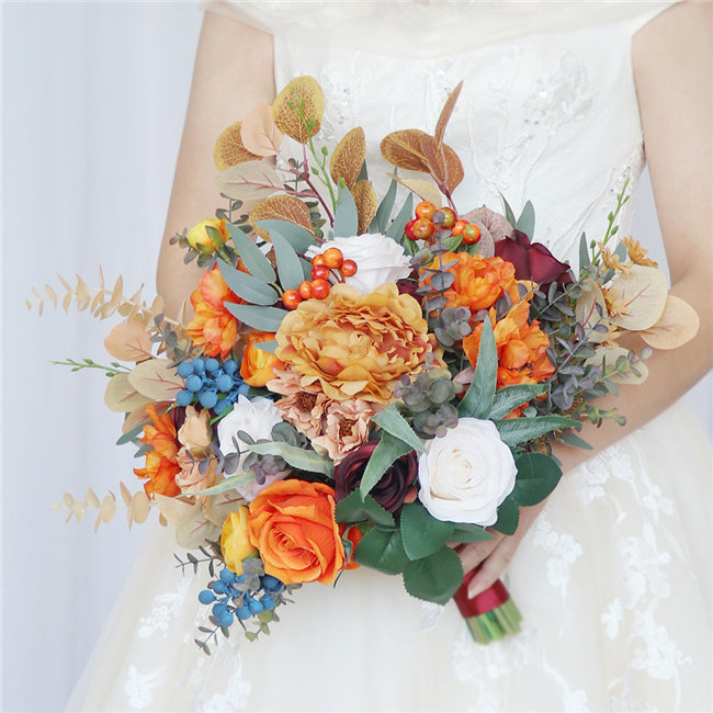 オレンジウェディングブーケ 造花ブーケ ブライダルブーケ ラウンドブーケ トスブーケ 結婚式 花束 ドレスと合わせて 撮影ブーケ