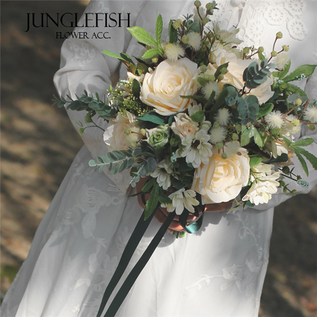 ホワイト+グリーンキャスケードブーケ ローズウェディングブーケ 造花ブーケ ブライダルブーケ ラウンドブーケ トスブーケ 結婚式 花束