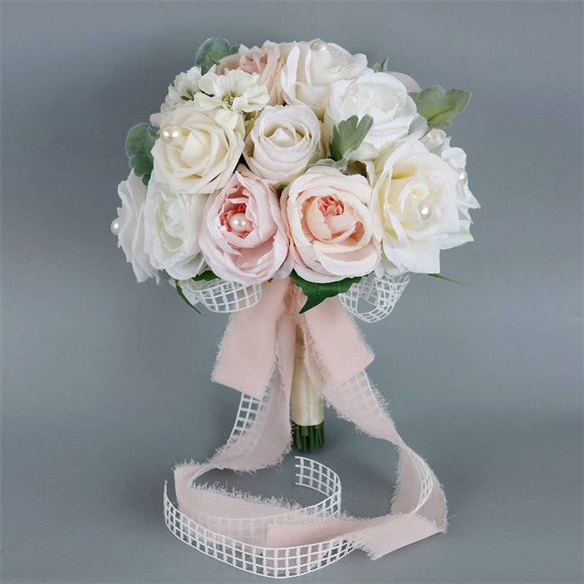シャンパン ピンクローズウェディングブーケ 造花ブーケ ブライダルブーケ ラウンドブーケ トスブーケ 結婚式 花束 ドレスと合わせて 撮影ブーケ