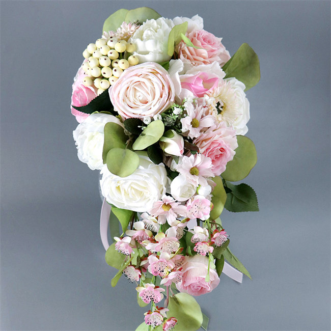 ピンク+グリーンブライダルブーケウェディングブーケ 造花ブーケ ブライダルブーケ ラウンドブーケ トスブーケ 結婚式 花束ローズ