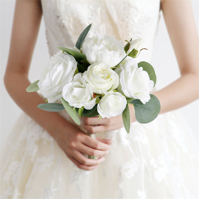 ホワイトウェディングブーケ 造花ブーケ ブライダルブーケ ラウンドブーケ トスブーケ 結婚式 花束 ドレスと合わせて 撮影ブーケ