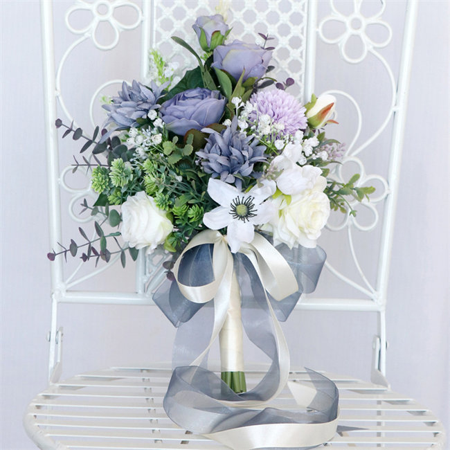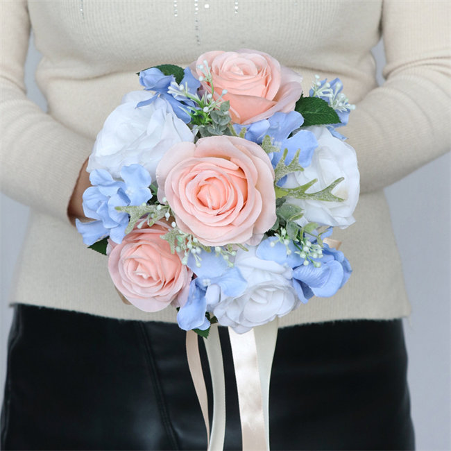 ブルー+ピンクウェディングブーケ 造花ブーケ ブライダルブーケ ラウンドブーケ トスブーケ 結婚式 花束 ドレスと合わせて 撮影ブーケ