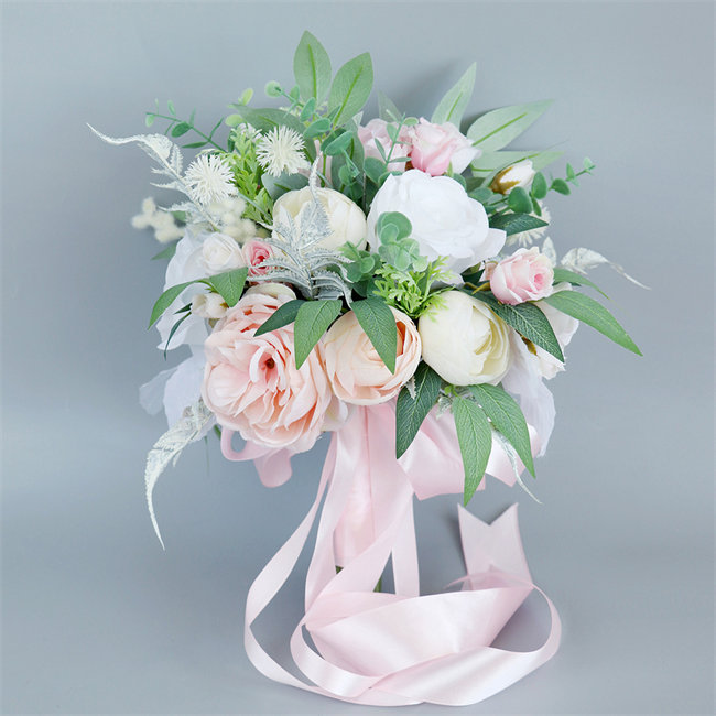 ホワイト+ピンクウェディングブーケ 造花ブーケ ブライダルブーケ ラウンドブーケ トスブーケ 結婚式 花束 ドレスと合わせて 撮影ブーケ