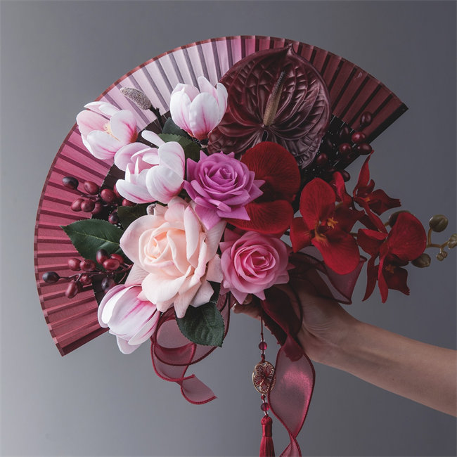 レッド系和装花嫁のブーケ 扇子ブーケ ローズのブーケ 春 花嫁 桜 扇子 和装婚用 ブーケ 和婚 着物 和小物 金 結婚式 神前式 前撮り 着物ドレス 和室インテリア 結婚式 和装