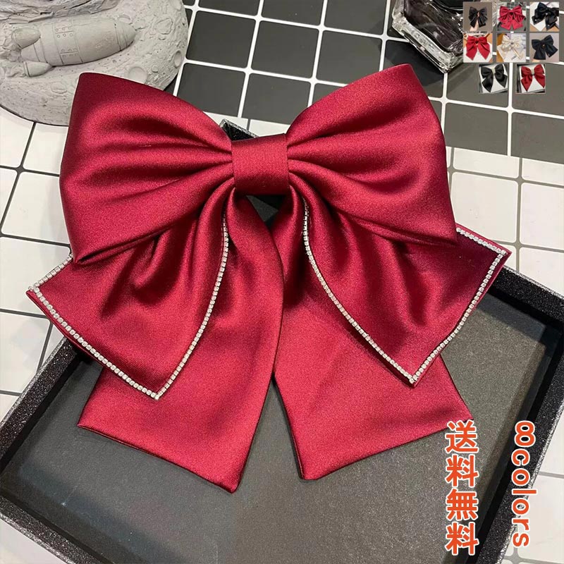バレッタ リボン サテン ラインストーン キラキラ ヘアアクセ ヘアピン ボリューム ヘアアレンジ ヘアアクセサリー シンプル 無地 まとめ髪 蝶結び 大人っぽい 女性 婦人用 キッズ 光沢 エレガン