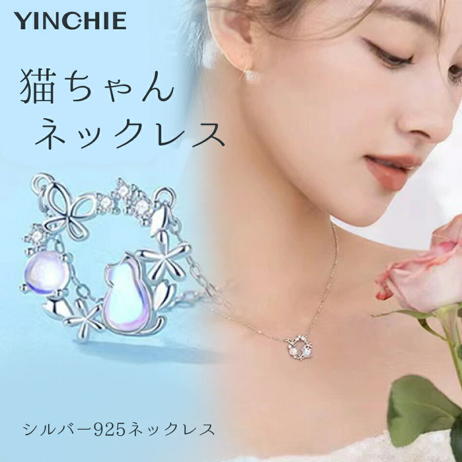 猫ちゃん ネックレス ギフト プレゼント レディース 月 猫 キャット シルバー フープ 円形 925 プラチナ色 誕生日 金属 アレルギー 対応 クリスマス バレンタインデー お祝い