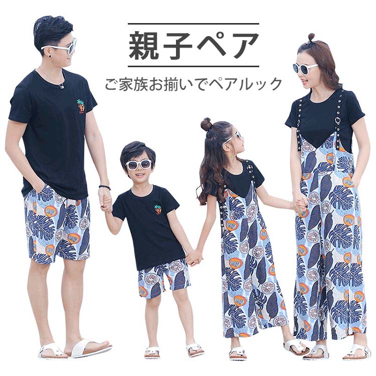 親子ペアルック 黒 Tシャツ 吊りズボン 半ズボン 家族 ペア 半袖ティーシャッツ 花柄 総柄 お揃いコーデ ハワイ風 レディース サロペット ママ パパ 男の子