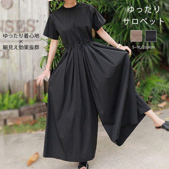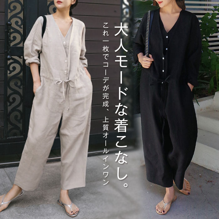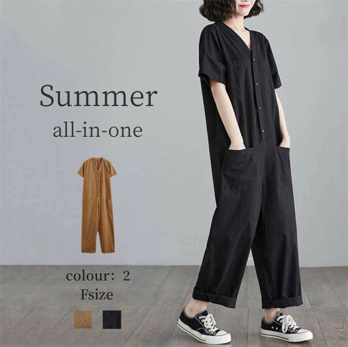 高品質 綿麻素材を使用 半袖パンツドレス All-in-one 春夏 ブラック 黒 ベージュ 20代 30代 40代 50代 体型カバー 着瘦せ おしゃれ カジュアル トレンド ♪
