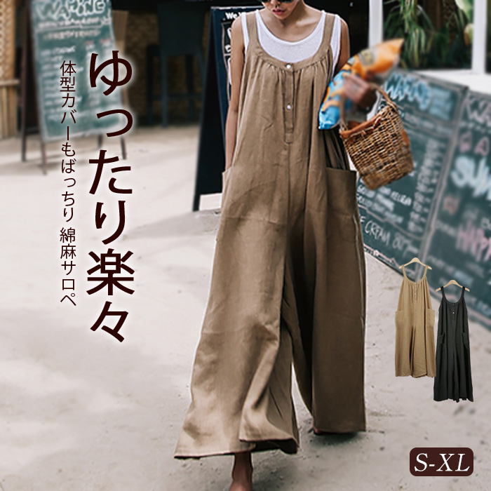 大人の抜け感~ 綿麻素材 サロペットパンツ Salopette pants ベージュ ブラック 黒 春夏 大きいサイズ S~XL 日常 デート リゾート 旅行 海 海外旅行 沖縄 ママコーデ お呼ばれ